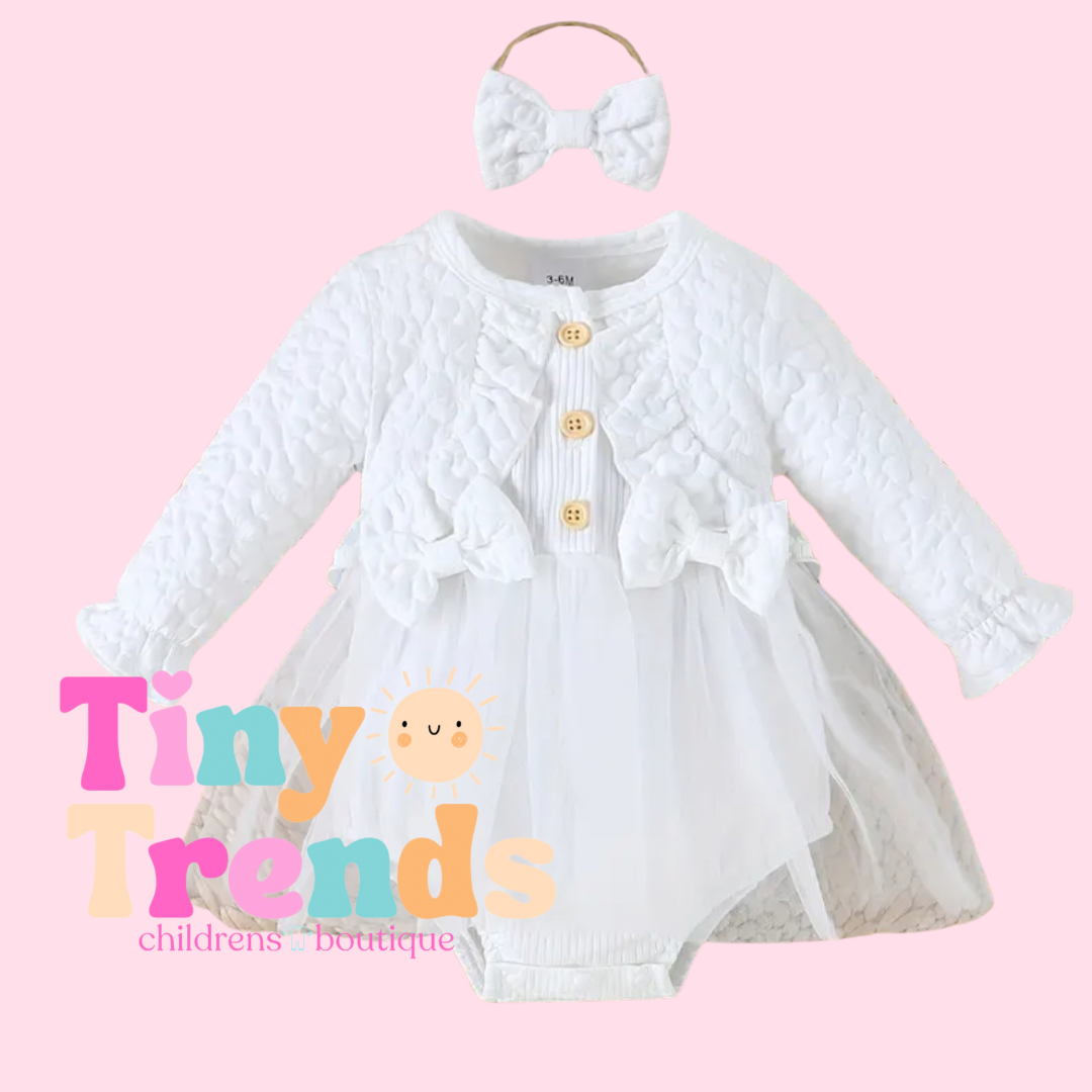 Get ready to bless the day away with our Blessed Dress! This all-white dress is the perfect choice for your baby girl's baptism or any special occasion. Its elegant design and soft fabric will make her look and feel like an angel. Order now and add a touch of grace to your little one's outfit.