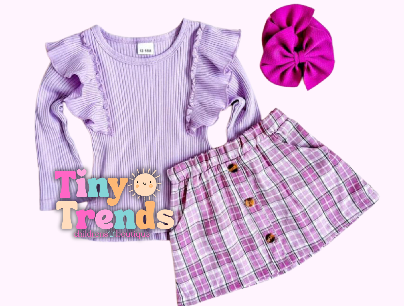 Match your little fashionista's spunk with this playful purple plaid skirt set. Includes a longsleeve shirt for chilly days. With this set, your little one will be the coolest kid on the block (or in the classroom). Grab it now before it's gone!