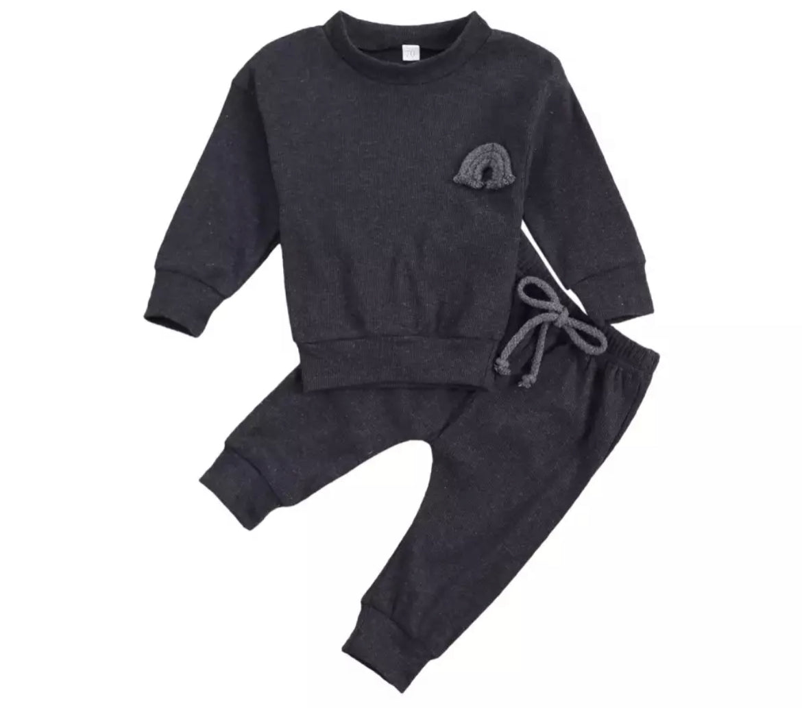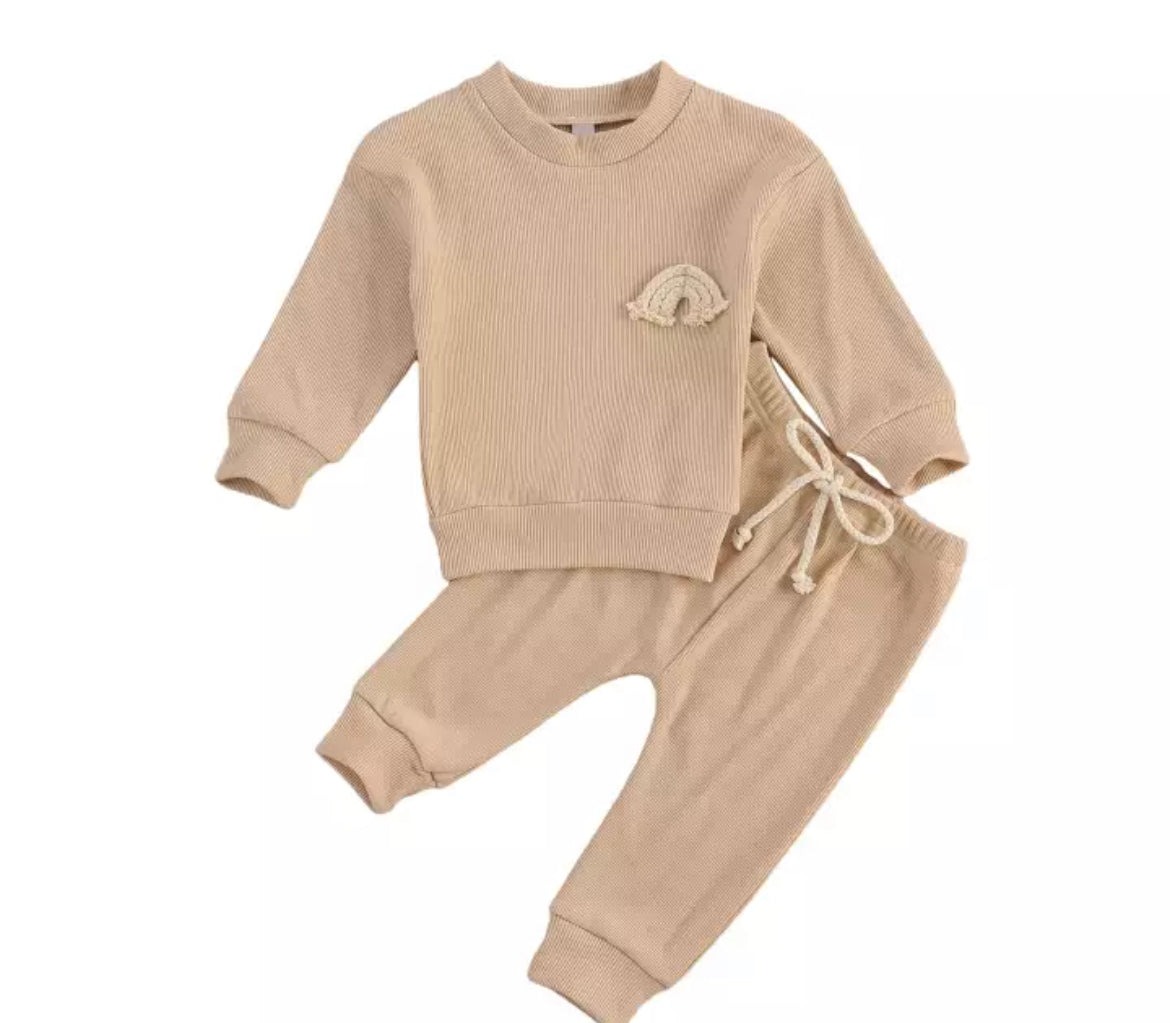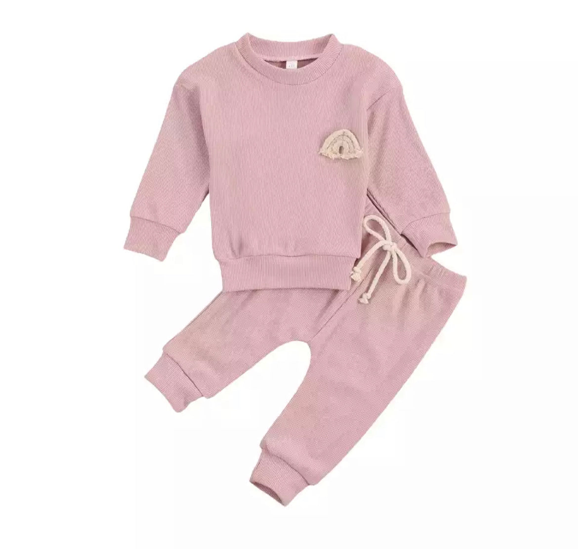 Comfy and Stylish. Ribbed outfit with a rainbow accent design on left side of longsleeve shirt.