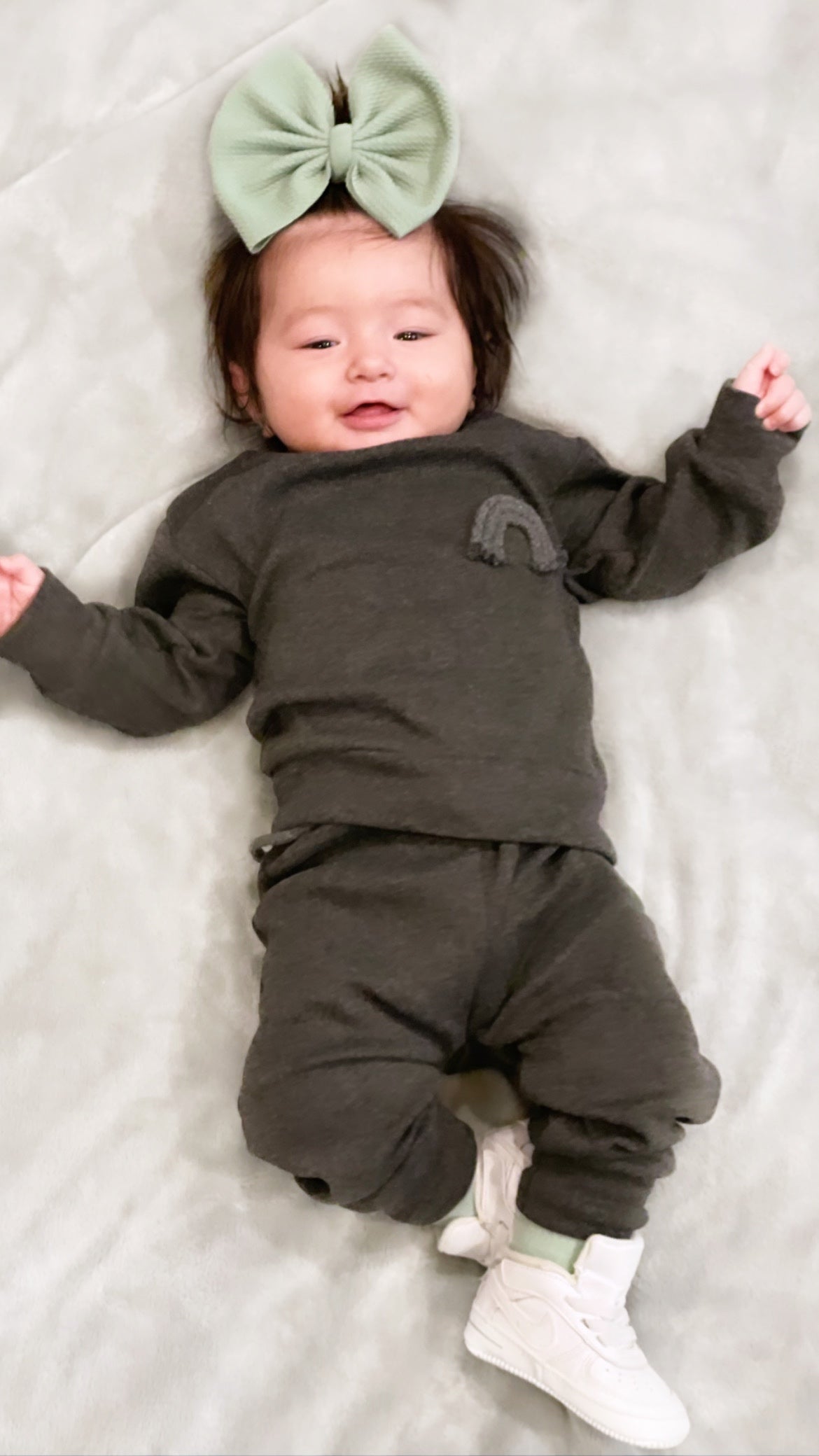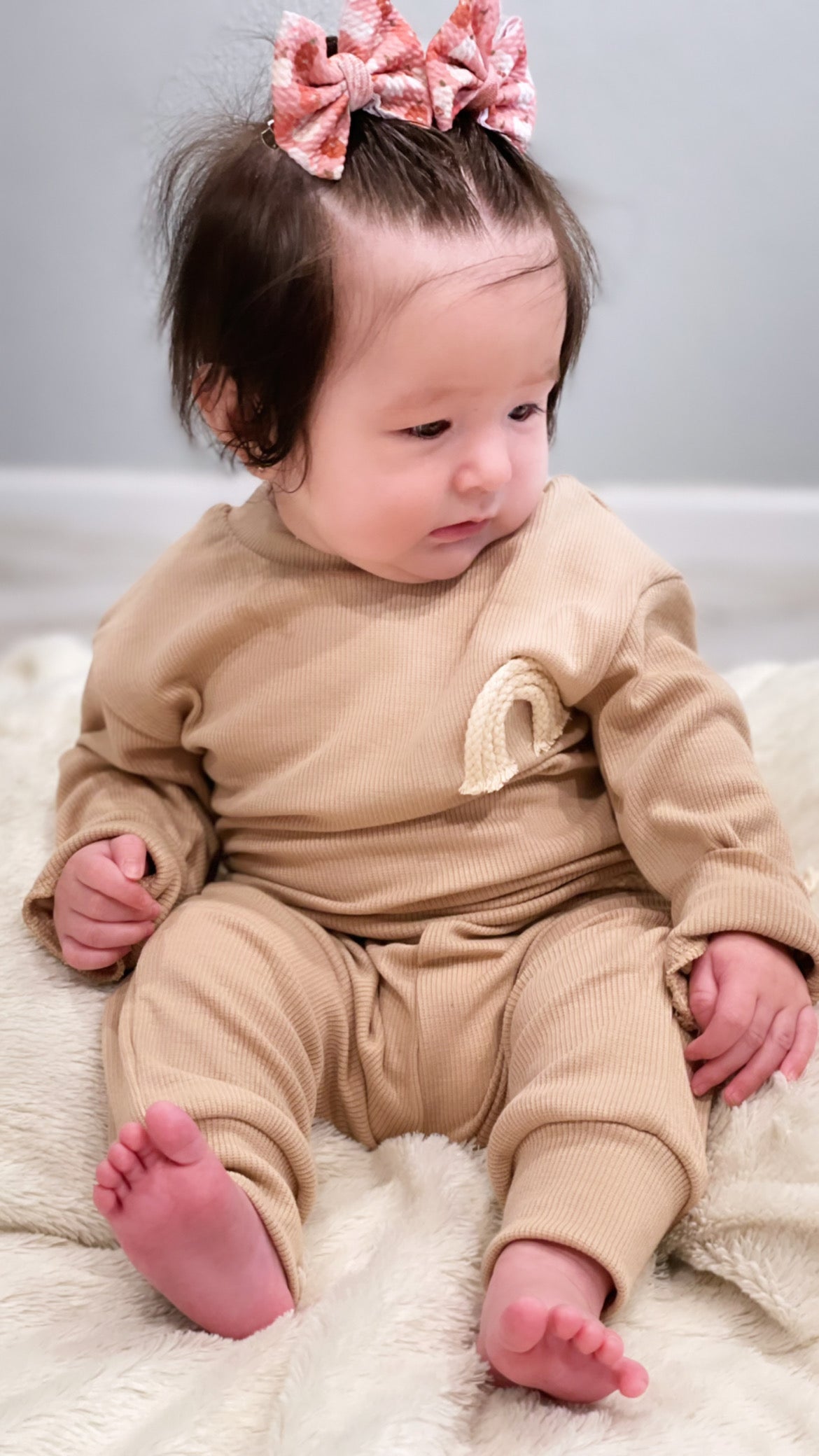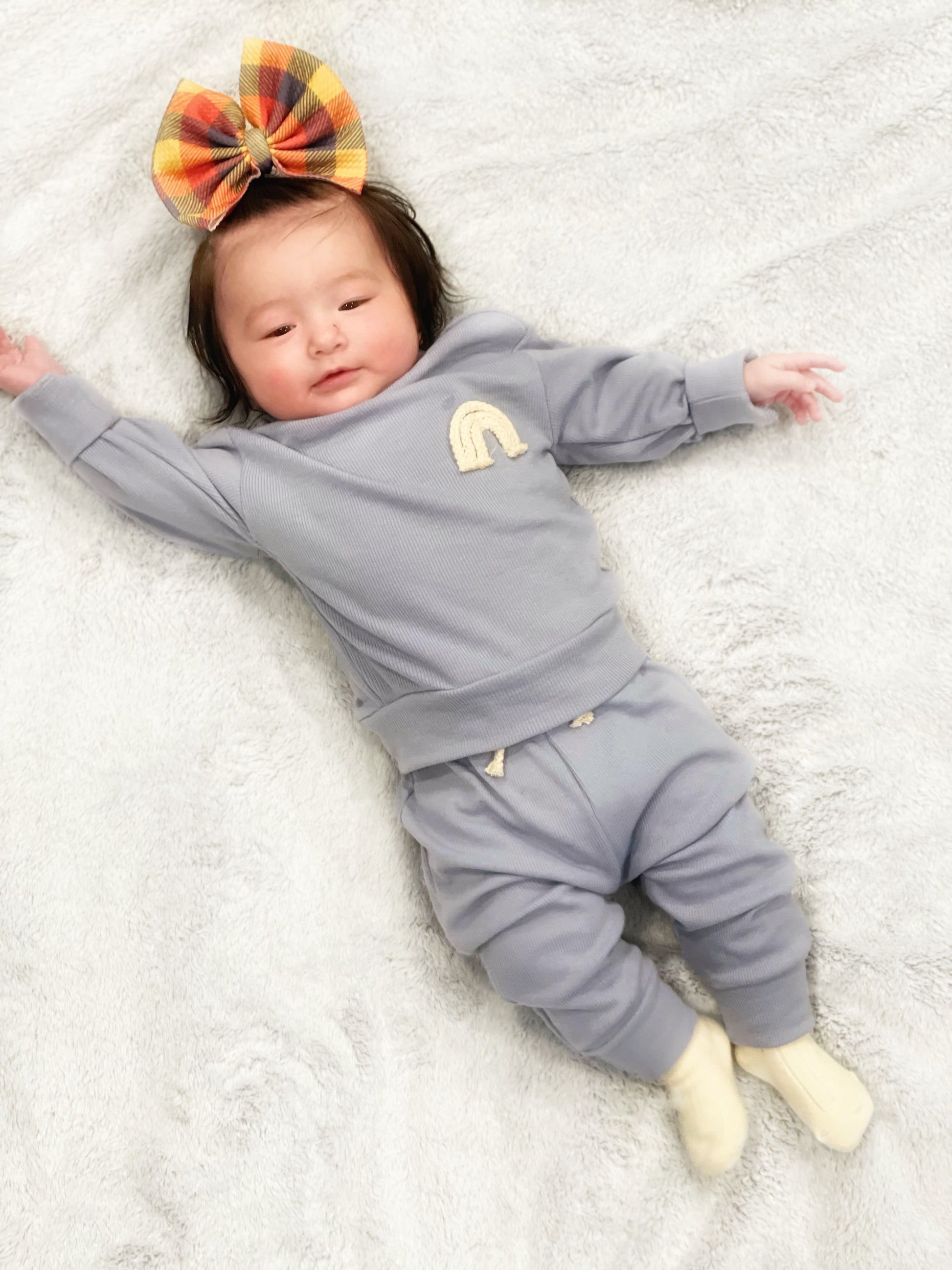 Comfy and Stylish. Ribbed outfit with a rainbow accent design on left side of longsleeve shirt.