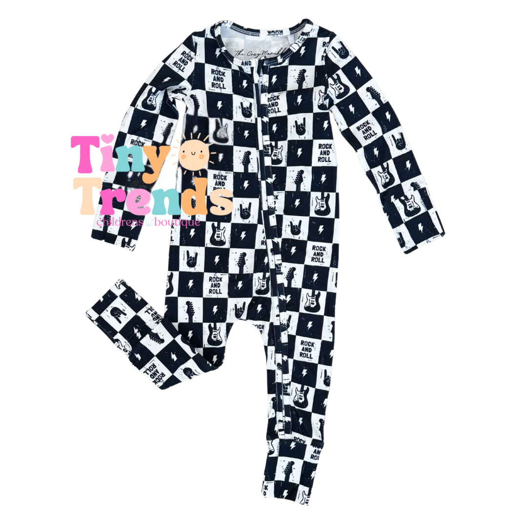 Inspired by the playful and energetic spirit of rock n roll, our Rock N Roll Zippy is the perfect choice for your little one's loungewear needs. With a full zip for easy diaper changes or undressing, this cute black and white footed pj set provides both style and convenience. Make dressing your baby a breeze with our Rock N Roll Zippy!