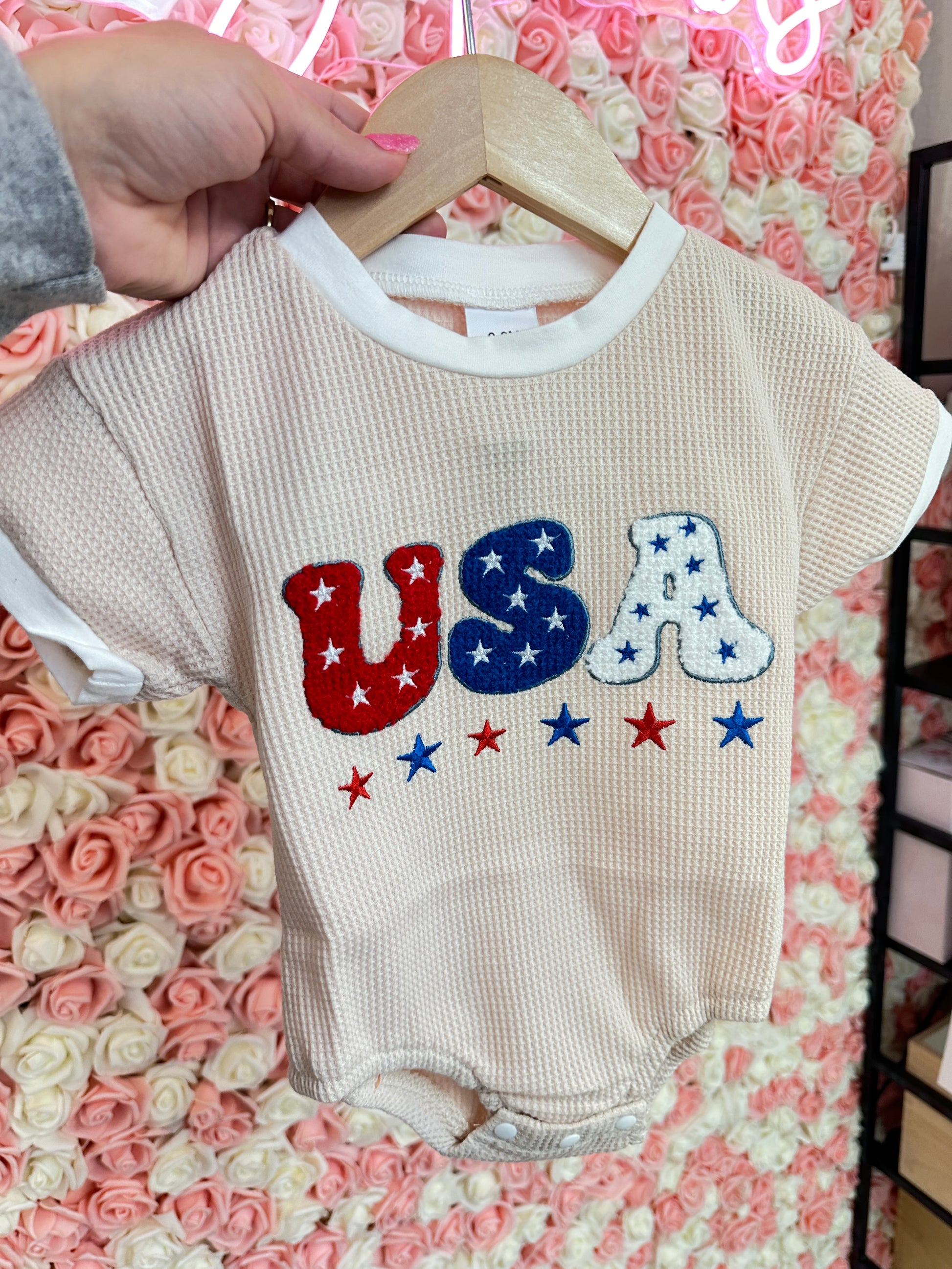Get your little one ready for Independence Day with our USA unisex romper! This adorable beige waffle fabric outfit features chenille patches and a playful "USA" print on the front, perfect for both baby boy and baby girl. Show off your patriotic pride with this stylish and comfortable romper.